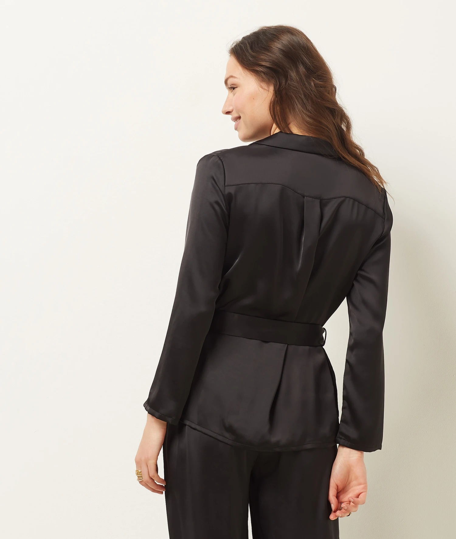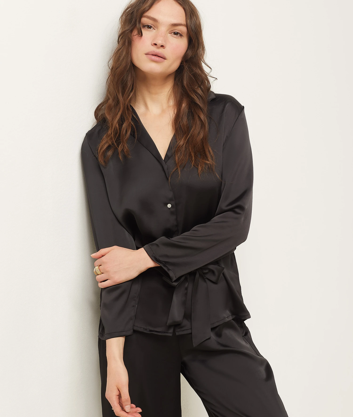 La chemise de pyjama se fait chic dans cette version nouée et satinée, à adopter en total look avec le pantalon coordonné.