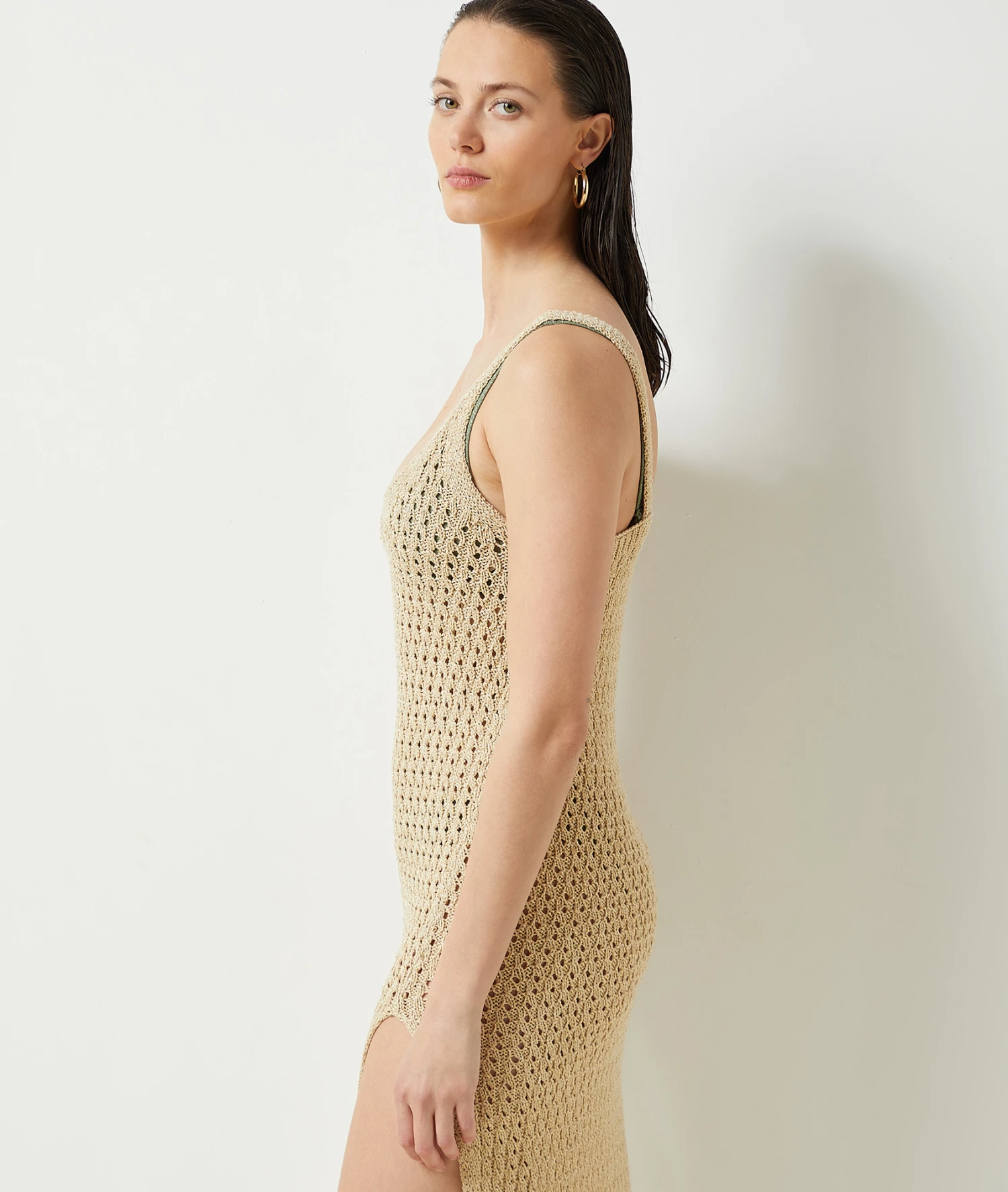 Un indispensable beachwear à glisser sur son maillot préféré. Confectionnée en crochet semi-transparent, cette robe mi-longue pailletée dévoile un décolleté en V plongeant ultra sexy et une fente sur le côté.