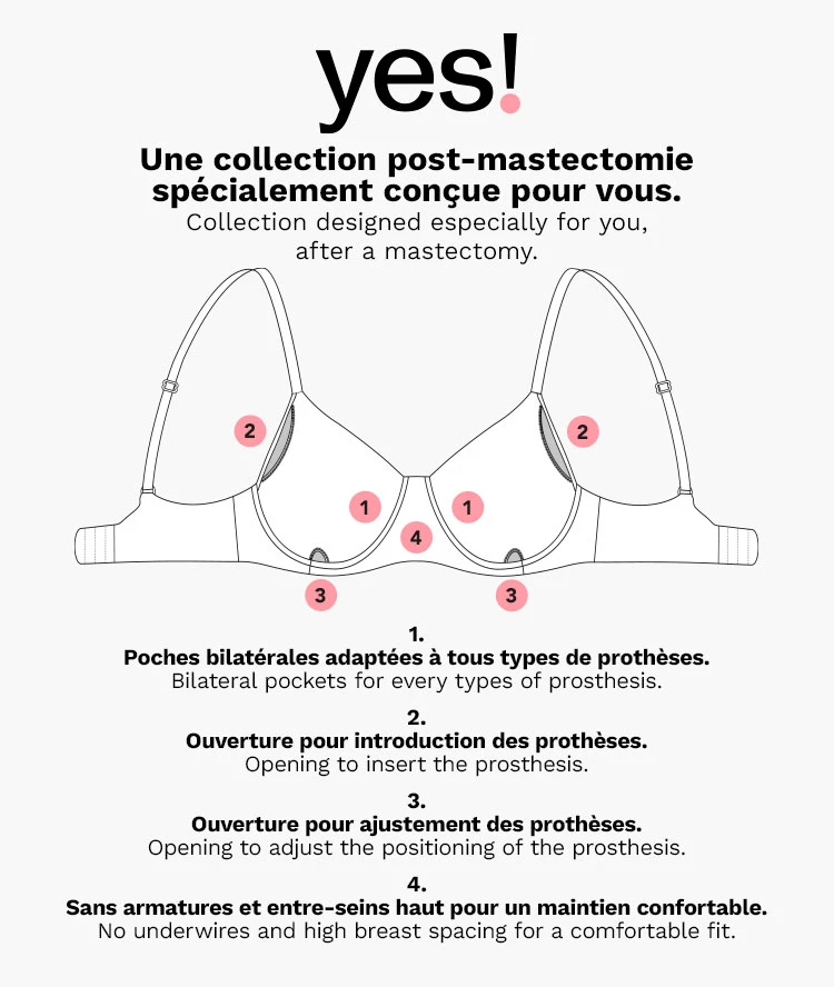 Parce que nous nous sommes donnés pour mission d’accompagner toutes les femmes, tout au long de leur vie dans les plus beaux moments comme dans les épreuves, nous lançons YES! , notre première collection de soutiens-gorge et maillots de bain spécialement conçus pour les post-mastectomies.